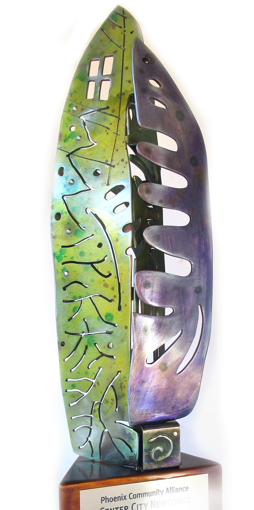 The central green leaf is hand plasma-cut with branching lines that suggest the veins of leaves, the roots of the tree, and the sophisticated Hohokam canal system upon which our city is built.