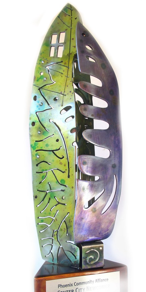 The Center City Award sculpture takes its inspiration from the Palo Verde tree, a Sonoran desert native. Its bright green bark which allows photosynthesis is echoed in the vibrant green patinas on steel. Though we may think of a tree’s canopy as its predominant feature, the vast network of roots underground are what support the tree’s health and growth.