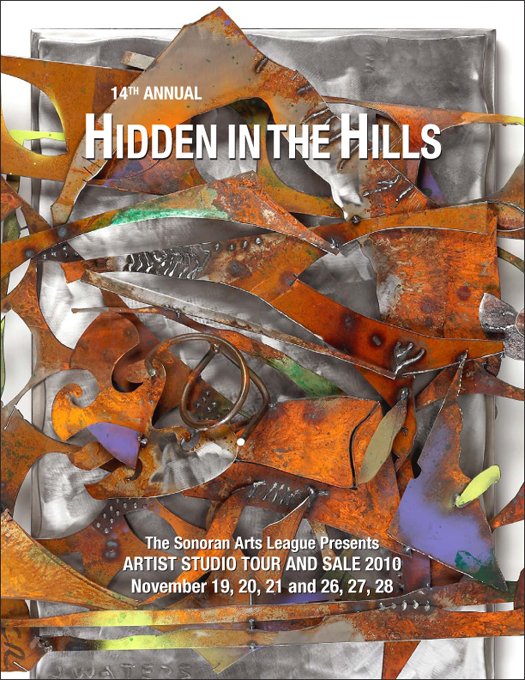 My second submission for the Hidden in the Hills Directory cover. I used “Tidepool Mambo”, rotated 90 degrees from its normal hanging position. This sculpture incorporates layers of steel with rust, patinas and some spray enamels, introducing some new, vibrant colors. Much as the studio tour invites visitors to explore the art and the area, the layers of steel create a sense of mystery which also invite the viewer in. (This was not selected for this year’s cover.)