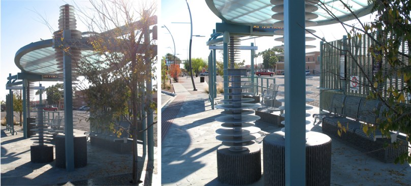 Artistic bus station designs by Joan Waters at Arizona Ave. and Chandler Blvd., in downtown Chandler, Arizona.